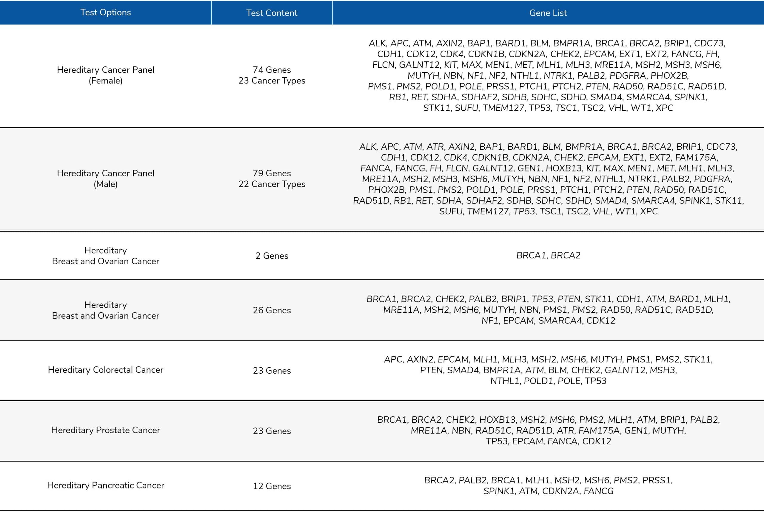 เรามีบริการตรวจยีนเสี่ยงมะเร็งทางพันธุกรรม แบบชุดยีน (Hereditary cancer gene panel testing) ให้บริการตรวจเป็นแพคเกจได้สูงสุด 79 ยีน ครอบคลุมมะเร็งทั้งหมด 24 ชนิด โดยเพศชายเลือกตรวจยีนมะเร็งได้สูงสุด 22 ชนิด (ไม่มีมะเร็งมดลูก และมะเร็งรังไข่) และเพศหญิงเลิอกตรวจยีนมะเร็งได้สูงสุด 23 ชนิด (ไม่มีมะเร็งต่อมลูกหมาก) ดังนี้